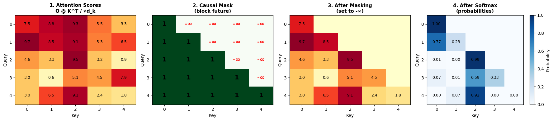 Just like a database query finds relevant records, the Query helps find which tokens in our sequence are most relevant to the current position. The model compares each Query against all Keys to compute attention scores, which determine how much each token should attend to every other token. These scores are then used to create a weighted sum of the Values.