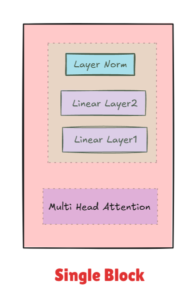 return self.layer_norm(self.dropout(pred) + x)The transformer architecture is built by stacking multiple layers of these MHA → FFN blocks. Each layer (or “transformer block”) gets progressively better at understanding the input. Below is a rough struct.