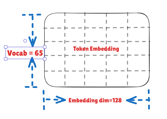 Embeddings are the individual vector representations we learn for each token in our vocabulary. This converts each token (character, in our case) into a multi-dimensional vector—typically something like 64, 128, or 512 numbers—that captures relationships between tokens. The model learns these vectors during training. Larger embedding dimensions lead to stronger learning of these patterns. For example, ‘a’ and ‘e’ might be used in similar contexts (both are vowels), so their embeddings become similar. These embeddings start as random numbers, and through training, the model gradually adjusts them to find optimal values that capture meaningful patterns. For the given itration of the expreiment, embedding dimensions is set to 128.