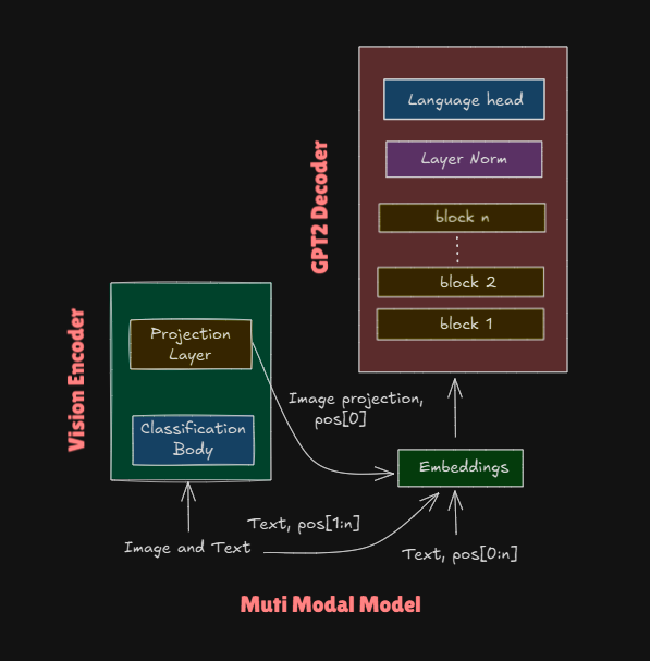 The final model as follows. The forward pass logic is slightly changed to accomodate the image. - When image is present: image → encoder → projection → add pos[0] → concat with text embeddings. 1. Token at pos[1] can see: [image] 1. Token at pos[2] can see: [image, token₁] 1. Token at pos[3] can see: [image, token₁, token₂] 1. And so on…