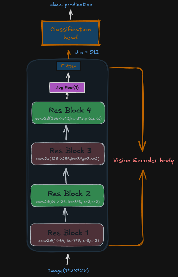 Why ResBlocks? They use skip connections—adding the input directly to the output. This helps gradients flow during training and lets the network learn both “what changed” and “what stayed the same.” Modern arch uses VIT(Vision Transformer) for encoding with same core principle. It have larger compression and efficency of learning. But CNN are smaller and faster to itreation. The encoder learns edges and other other shape present in the image. The final layer known as classification head which takes in the embedding and predicts the object. It is dicarded after pretraining only encoder is kept.