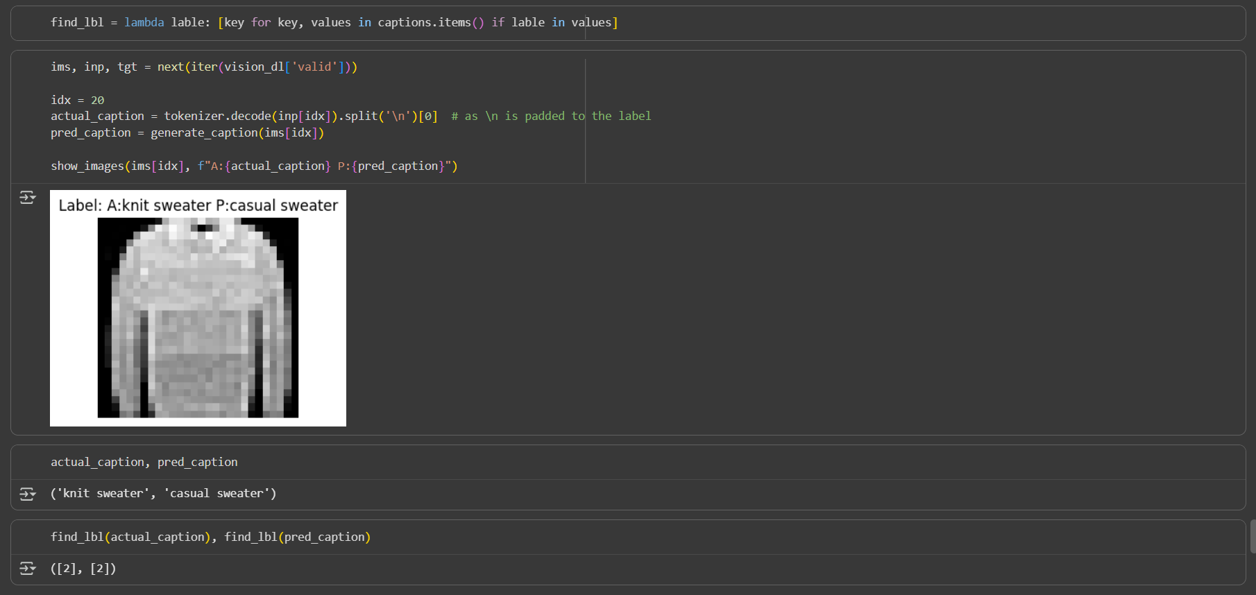 The model predicts caption casual sweater where as the original caption is knit sweater. It all belongs to same class so the classification is working properly.